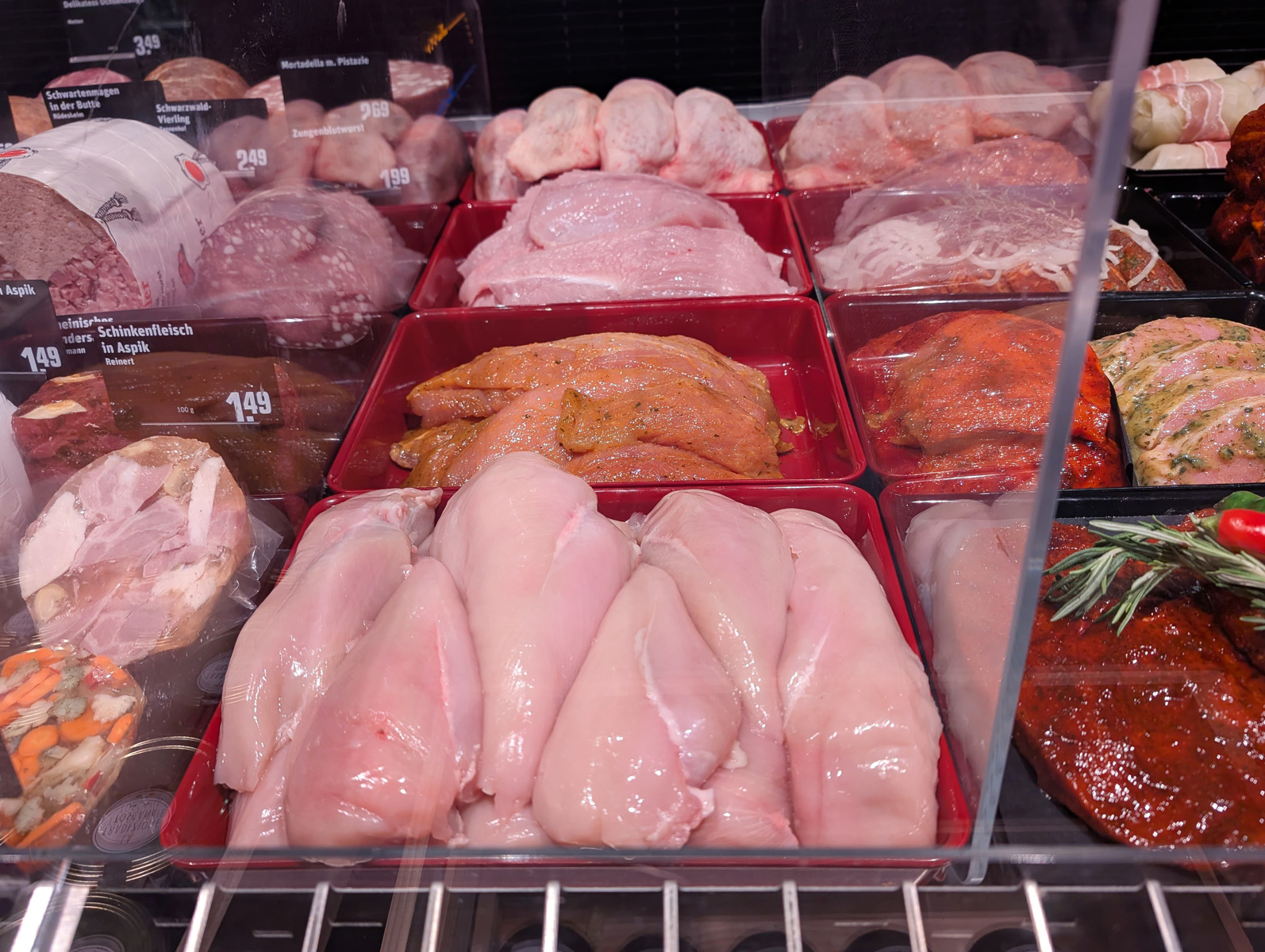 Rote Thekenschale der Serie FRESH kennzeichnen Gefügel in den Frischetheken.