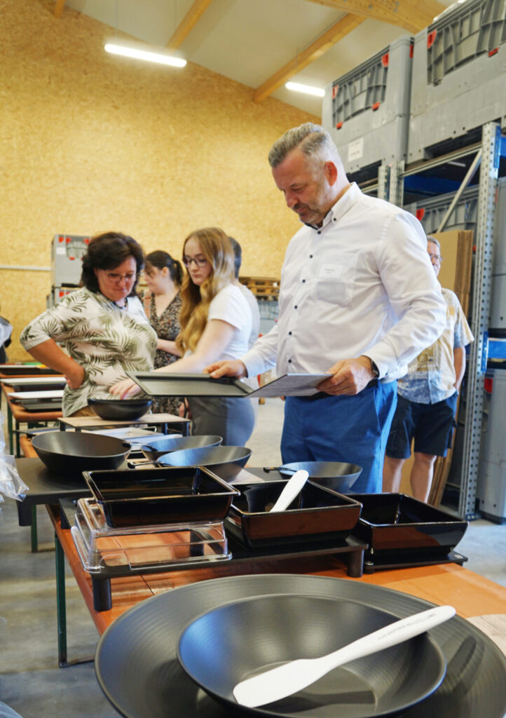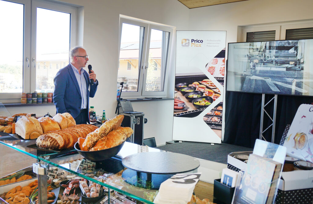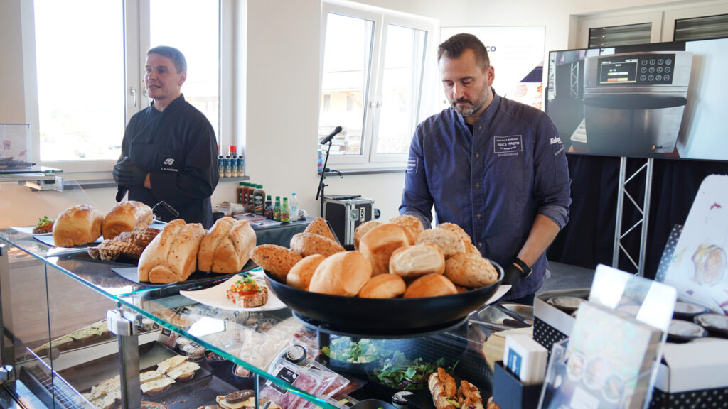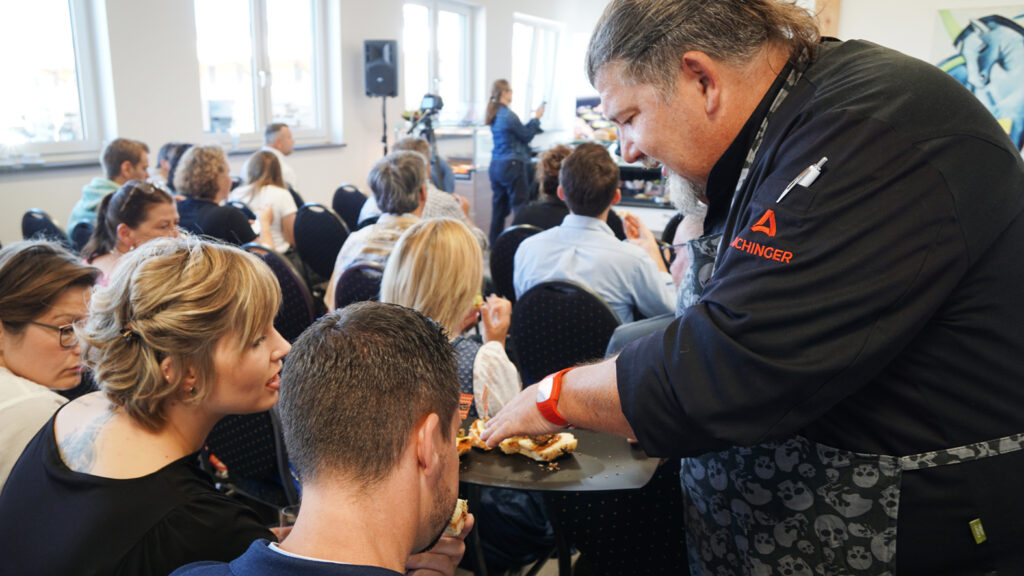 Vom Spiegelei aus dem Highspeedofen von Atollspeed über das klassische Vesperbrot bis zum „Udon Ding“ mit Coleslaw – Stefan Klausmann von Bedford Wurst- & Schinkenmanufaktur und Sascha Wenderoth von den Snackprofis – Konzept & Workshops haben beim ersten Snackworkshop bei uns in Eresing ordentlich eingeheizt. 35 Teilnehmer*innen konnten zusehen, wie die Beiden „kleine Geile“ (so nennt Wenderoth seine Snacks gerne) am laufenden Band produzierten, belegte Brote „pimpten“ und die Snacks appetitlich in den Theken von AICHINGER und auf den Thekenschalen von PricoPlex präsentierten. Gekonnt spielten sich die beiden Snack-Experten die Bälle zu und hatten für Metzger und Bäcker gleichermaßen innovative Anregungen und Praxistipps dabei. Für den besonderen Aha-Effekt sorgte das Vesperbrot mit dem speziell dafür entwickelten Brotpapier von Bedford.