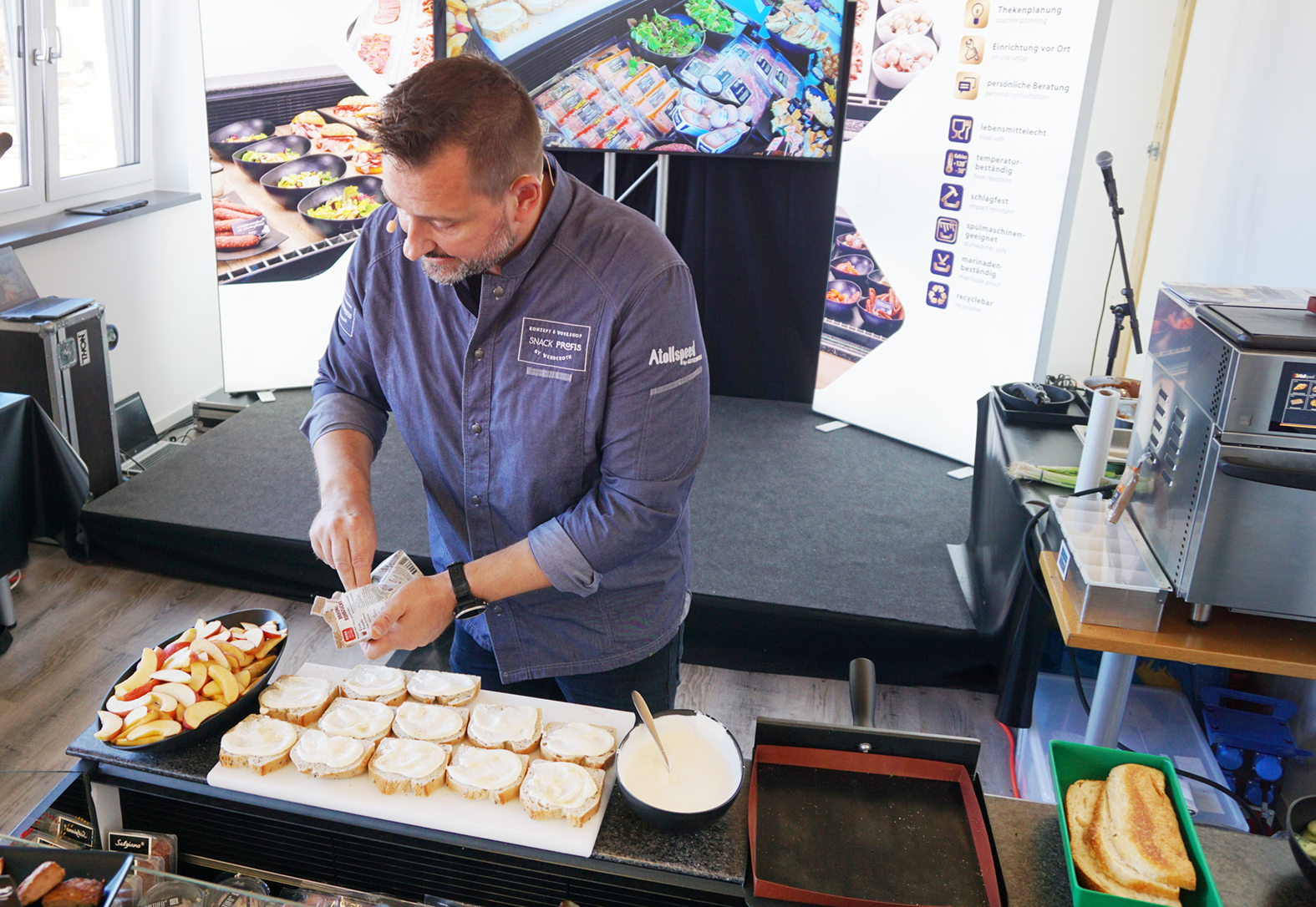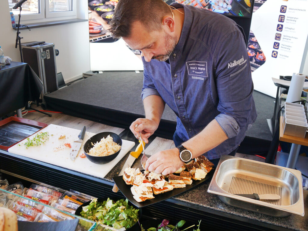 Zeitgemäße, individuelle Food-Konzepte und Lösungen für die Gastronomie & Hotellerie im deutschsprachigen Raum. SNACKPROFIS stellen ein Highspeed Ofen von Atollspeed, Backwaren, Käse und Salate zur Verfügung. Sascha Wenderoth zaubert damit warme Snacks.